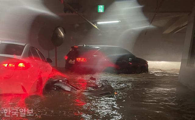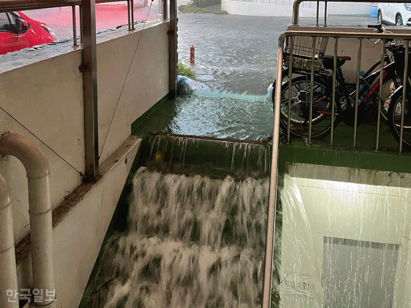 태풍 힌남노의 영향으로 집중호우가 쏟아진 6일 오전 경북 포항시 인덕동 W아파트단지 지하주차장에서 주민 7명이 차량을 이동시키려다 실종됐다. 당시 지하주차장으로 빗물이 쏟아져 들어오는 긴박한 장면을 독자가 한국일보에 알려왔다. 사고 당시 사진을 보면 지하주차장 입구 출입문이 휘어질 정도로 많은량의 빗물이 순식간에 들이찼다. 지하주차장을 나서는 주민들의 차량에도 이미 바퀴까지 물이 차 올라, 당시 얼마나 급박한 상황이었는지 보여준다.