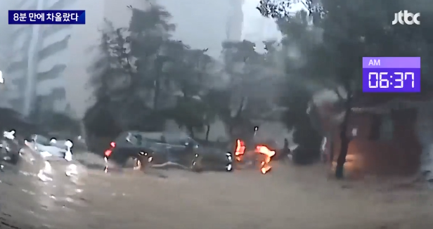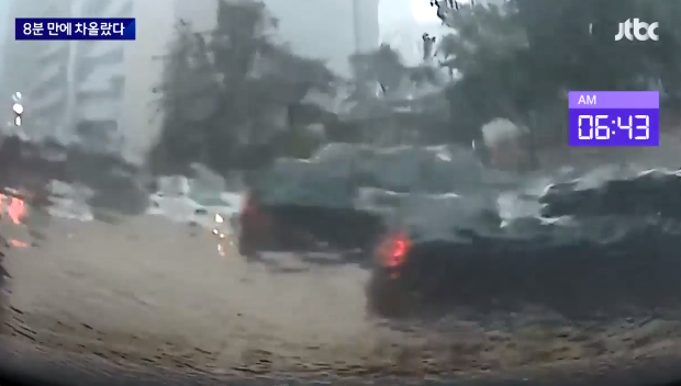 처음 나온 검은색 SUV 차량은 지상으로 나온 뒤 어디로 갈지 고민하는 듯 잠시 멈춰섰고, 그 뒤를 따르던 차량도 정차했다. 2분이 흐를 동안 지하주차장을 빠져나온 차량은 겨우 5대. 잠깐의 시간에 지상에도 물이 급격히 차올랐고, 당황한 차량은 서로 뒤엉켜 갈 곳을 찾지 못했다.