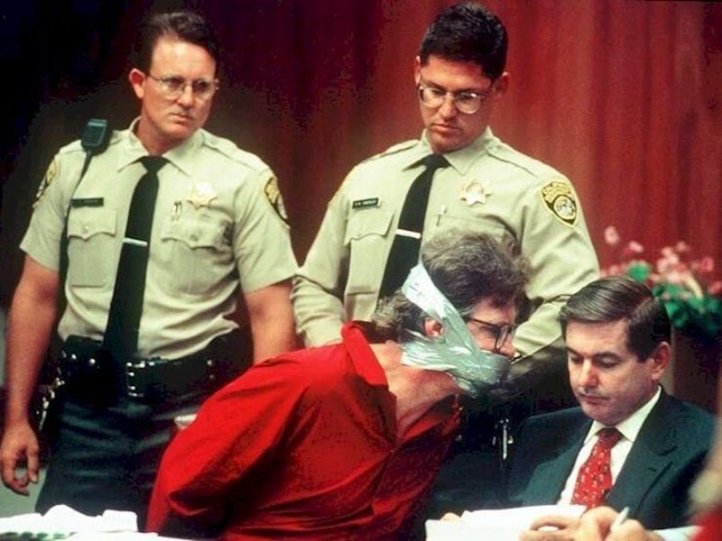 It was taken at the 1995 murder trial of Christopher Charles Lightsey, who had to be gagged because he was being extremely obscene, reportedly. Imagine the backlash if guards tried to do this today?