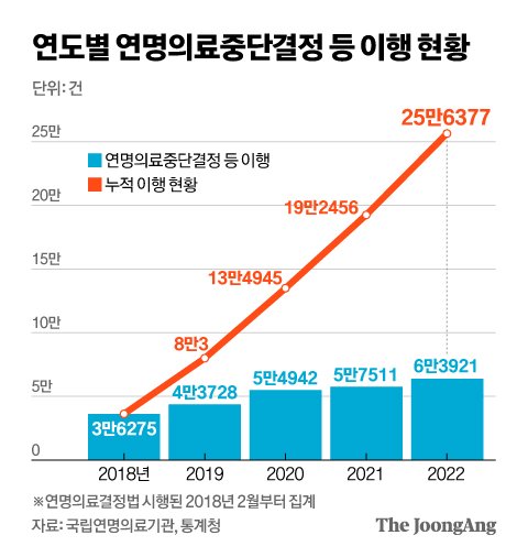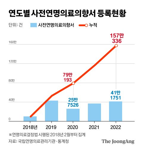 존엄사에 대한 인식이 확산하면서 건강할 때 미리 존엄사를 서약하는 이들도 늘었다. 지난해 말 기준으로 157만여명이 사전연명의료의향서를 등록했다. 이는 19세 이상 성인인구의 3.6%, 65세 이상 노인의 13.1%를 차지한다.