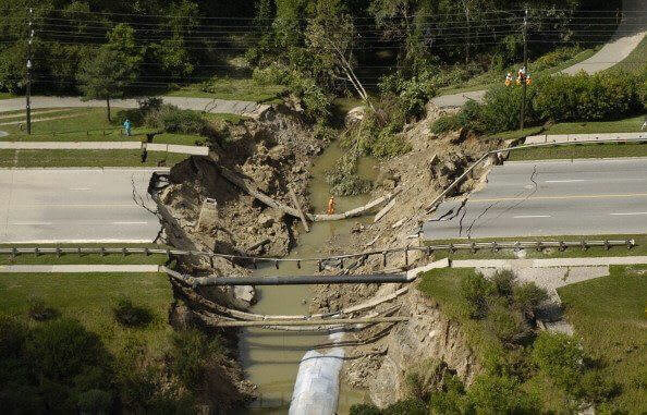 이 사진의 피해는 폭풍 중에 범람한 물이 가벼운 장애물을 넘듯이 길을 무너뜨린 모습을 보여주고 있습니다.