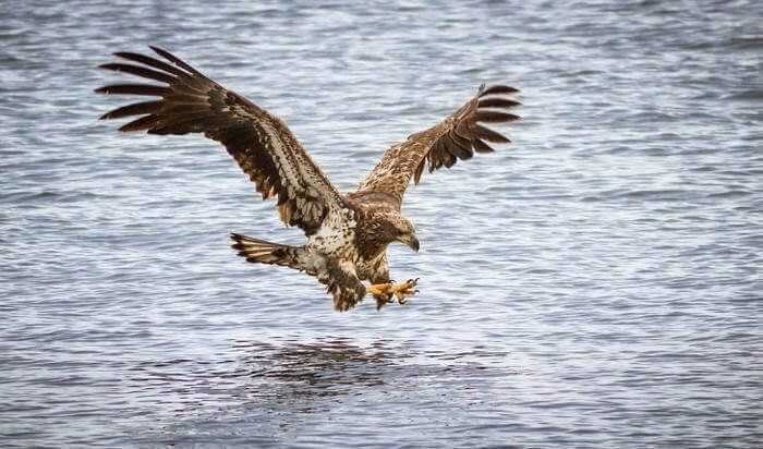 독수리가 빠른 속도로 물고기를 낚아채려는 찰나에 찍힌 사진입니다.