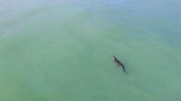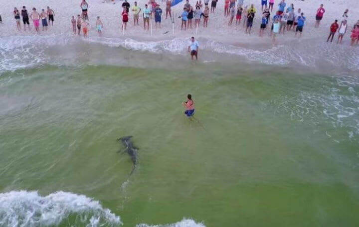 이제껏 드론이 포착한 장면 중 가장 절묘한 타이밍을 자랑하는 사진부터 보겠습니다. 이 사진은 플로리다 주의 파나마시 해변에서 포착되었습니다. 이 사진에는 상어를 감아 올리기 위해 사투를 벌이는 어부와, 안전거리에서 이를 지켜보고 있는 사람들을 볼 수 있습니다. 다행히도 어부는 성공했고, 상어는 다시 바다로 풀어 주었습니다.
