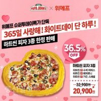 [통신일보 = 소피아 기자] 한국파파존스(회장 서창우)가 화이트데이인 14일 단 하루, 위메프에서 단독으로 하트씬 피자를 할인 판매한다. 파파존스 피자는 화이트데이를...