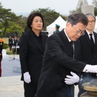 기자 = 문재인 대통령과 김정숙 여사가 19일 서울 강북구 국립4.19민주묘지에서 열린 제60주년 4.19혁명 기념식에 참석한 뒤 故 전한승 군 묘를 참배하고 있다. 2020.04.19...