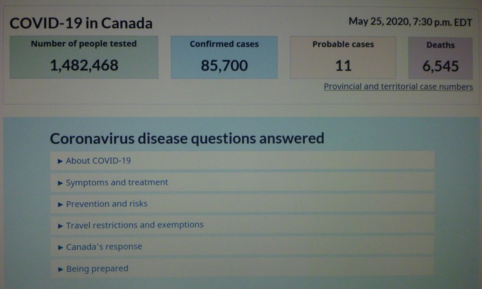 ■ 20200525 MON 19:30 기준 COVID-19 in CANADA/사망자 6,545명(5월 24일 대비 121명 증가)