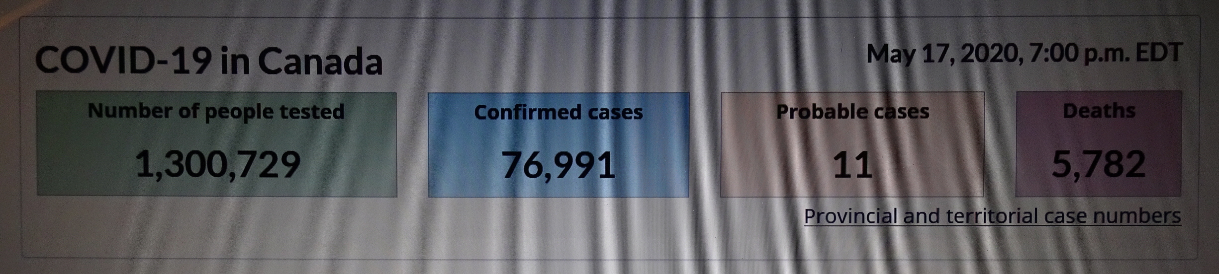 ■ 20200527 WED 19:30 기준 COVID-19 in CANADA/사망자 6,765명(5월 26일 대비 126명 증가)