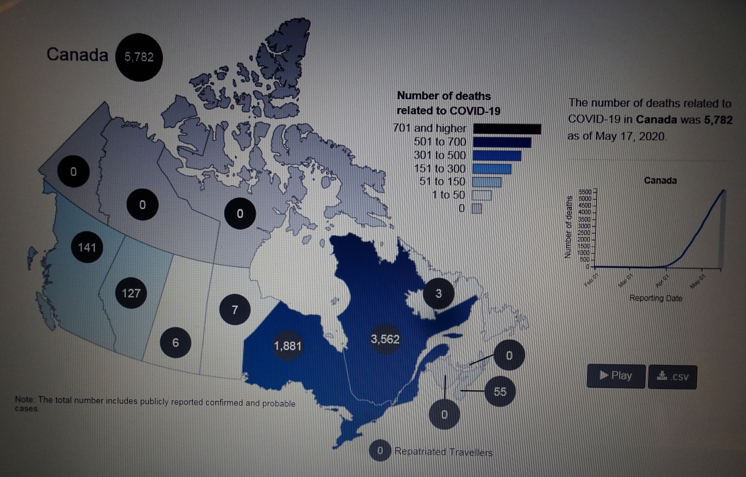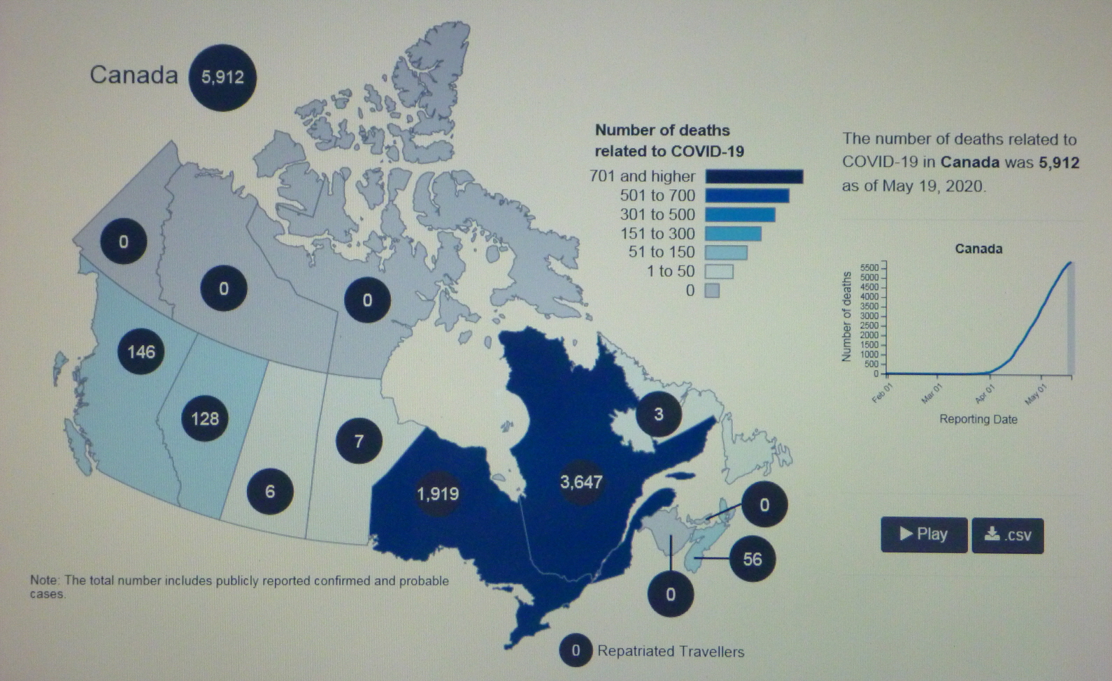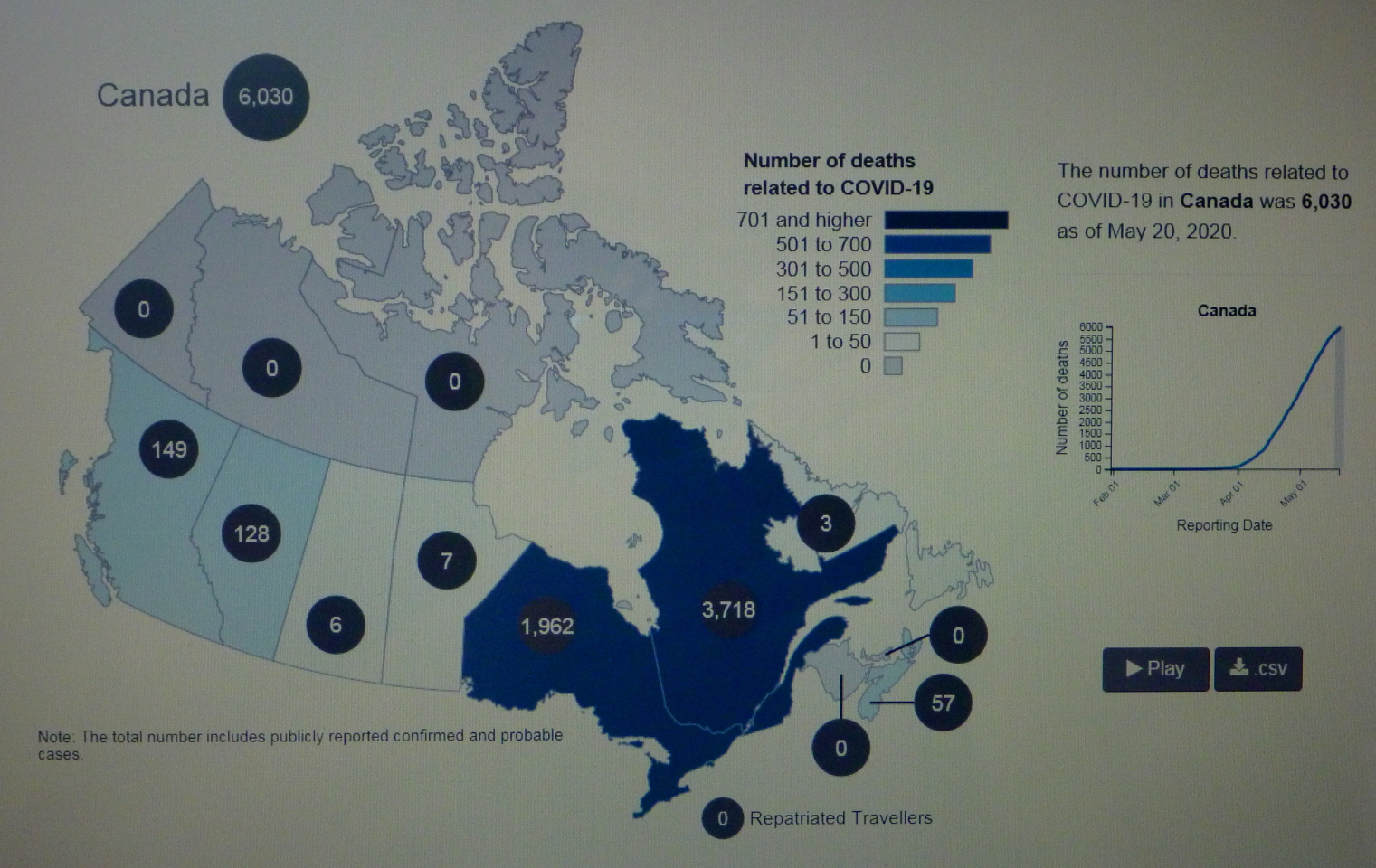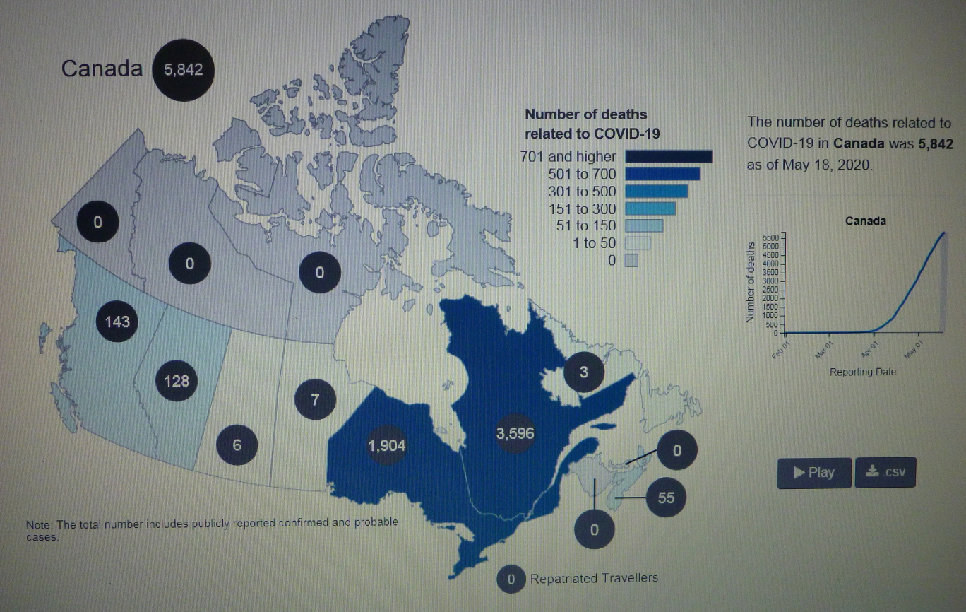 2020년 5월 20일(수) 19:00 현재 COVID-19 Pendemic으로 인한 CANADA의 사망자가 6,030명을 기록하고 있다.