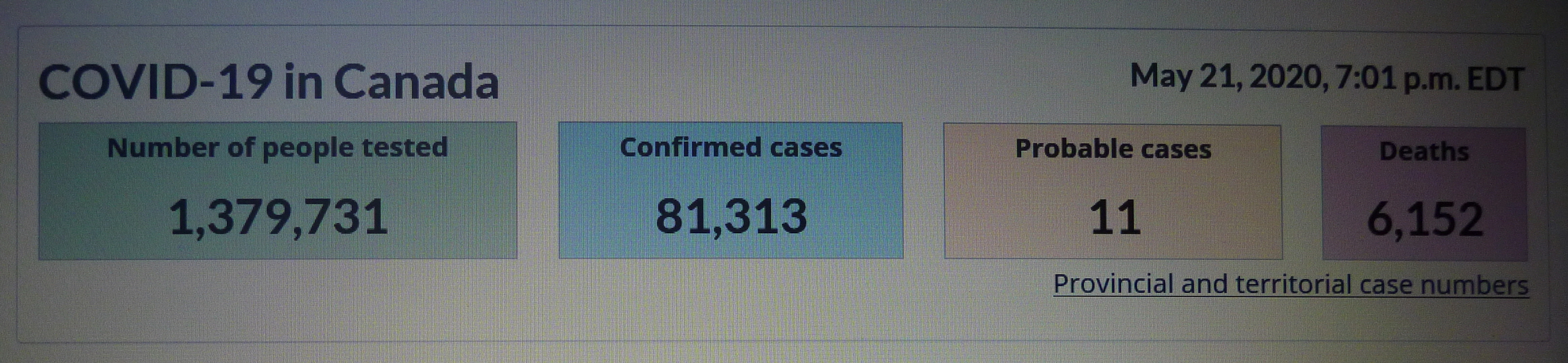 ■ 20200521 THU 19:00 기준 COVID-19 in CANADA/사망자 6,152명(5월 20일 대비 122명 증가)