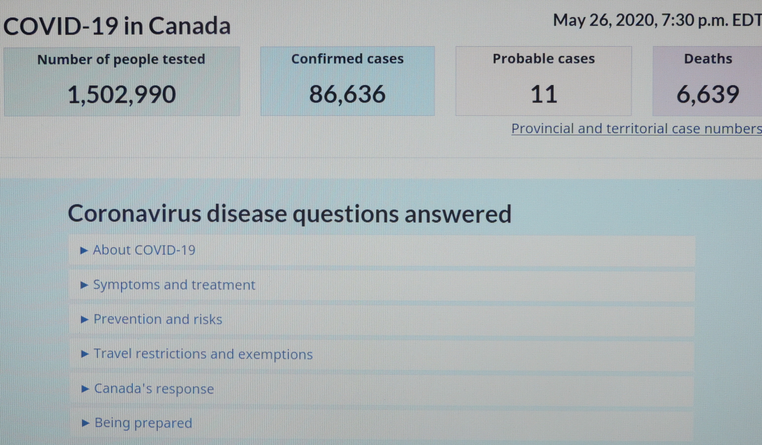 ■ 20200526 TUE 19:30 기준 COVID-19 in CANADA/사망자 6,639명(5월 25일 대비 94명 증가)