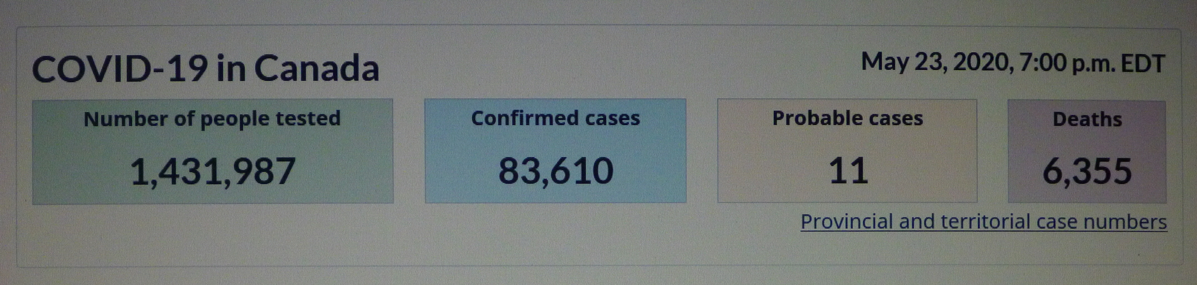 ■ 20200523 SAT 19:00 기준 COVID-19 in CANADA/사망자 6,355명(5월 22일 대비 85명 증가)