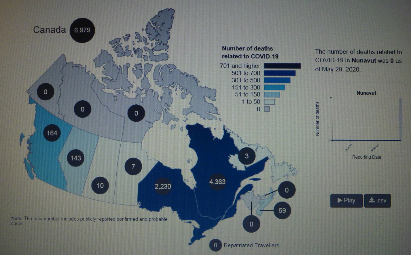 ■ 20200529 FRI 19:01 기준 COVID-19 in CANADA/사망자 6,979명(5월 28일 대비 102명 증가)