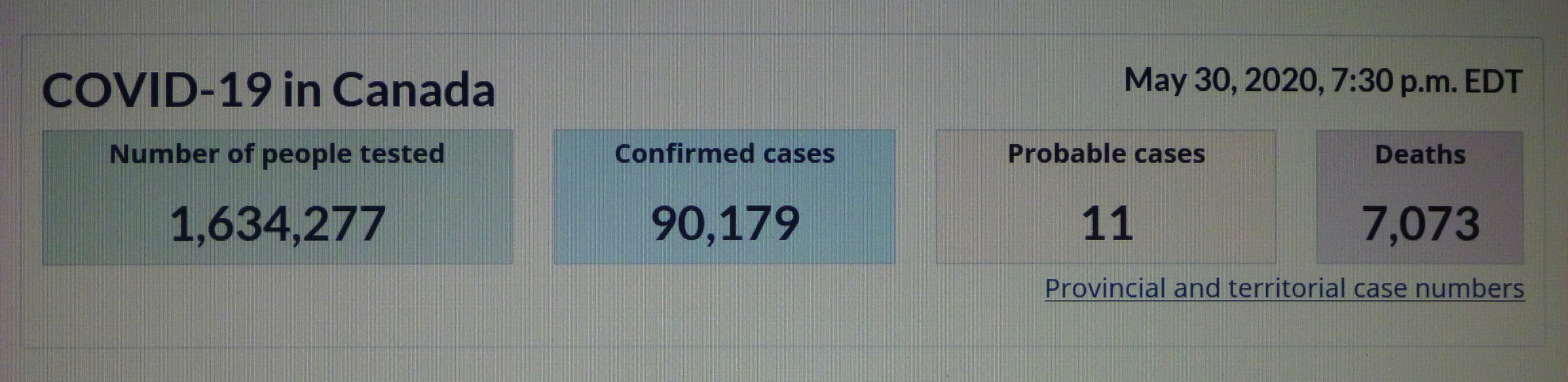■ 20200530 SAT 19:30 기준 COVID-19 in CANADA/사망자 7,073명(5월 29일 대비 98명 증가)