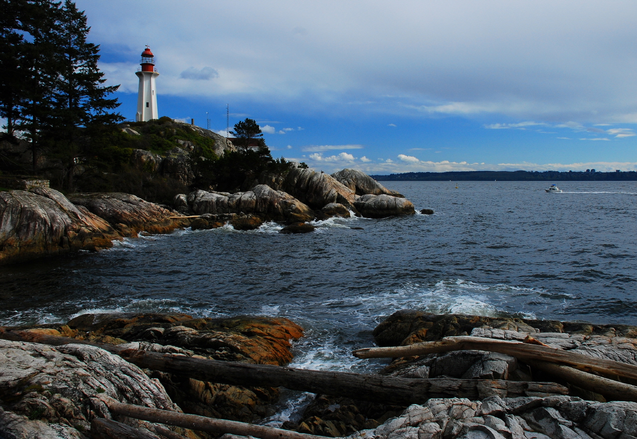 Point Atkinson Lighthouse was built in 1914 on granite boulders jutting out into Burrard Inlet in West Vancouver, Canada. The reinforced concrete structure replaces an earlier wood structure built in 1875. The concrete structure was considered at the time innovative in lighthouse design. It is now automated and still in use.[2]