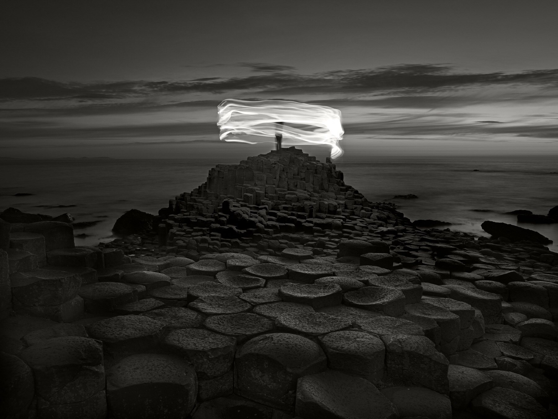 This picture, that is part of the "Nightscapes" series, was taken in Northern Ireland. The Giant's Causeway is an ancient part of the coast. Is an area of about 40,000 interlocking basalt columns, the result of an ancient volcanic fissure eruption. The tops of the columns form stepping stones that lead from the cliff foot and disappear under the sea. This place, so still and immovable, is illuminated by the moving light, that is fluid and changing. Two elements in contrast, and between them there is the figure of a man, on the top of the rock.