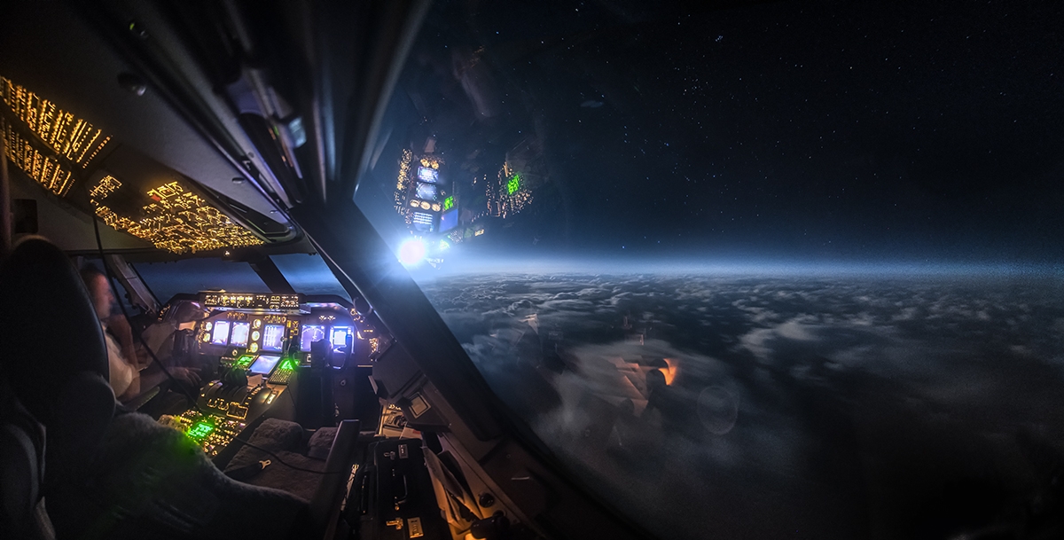 Full moon. About to cross 30 West, halfway a stormy Atlantic Ocean when the radiant moon ascents above the horizon. Blinding out most stars, the bright lunar spell adds a touch of magic to the world around me. Silver-painted clouds drift by while the capsule of the 747 cockpit allows me to breathe, live and appreciate this alien-like landscape. Far beyond, the gently glowing horizon marks the delicate edge of space. Almost home.