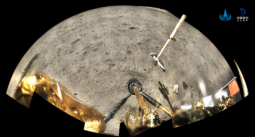 지난달 24일(이하 현지시간) 발사돼 지난 1일 달 표면에 착륙했던 중국의 무인 달 탐사선 창어 5호가 3일 달의 토양과 암석 채취 임무를 완수하고 이륙하기 직전 국기인 오성홍기를 꽂았다. 중국은 미국 우주인 버즈 올드린이 성조기를 처음 꽂고 1972년까지 다섯 개의 성조기를 더 꽂은 뒤 51년 만에 달에 국기를 꽂은 두 번째 나라가 됐다.중국 국가항천국(CNSA) 제공 EPA 연합뉴스