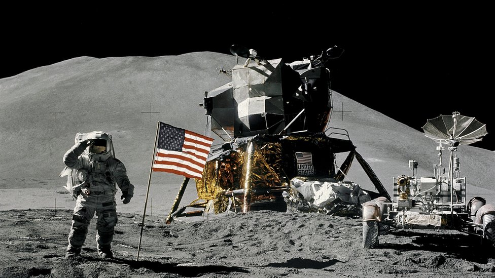 1971년 미국 우주인 제임스 어윈이 성조기를 꽂은 뒤 거수경례를 하고 있다.로이터 자료사진
