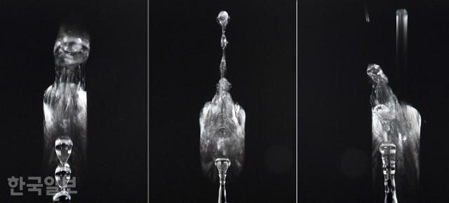 물방울이 또 다른 물 표면과 충돌하는 순간을 특수 렌즈와 조명을 활용해 촬영하면 다양한 형태가 나온다. 왼쪽부터 '올빼미' '타조' '닭'을 닮은 물방울. 서재훈 기자