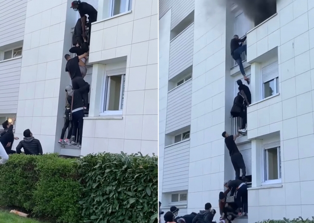 프랑스 낭트의 한 아파트 화재 현장에서 시민들이 인간 사다리를 만들어 일가족을 구하는 영상이 공개됐다.