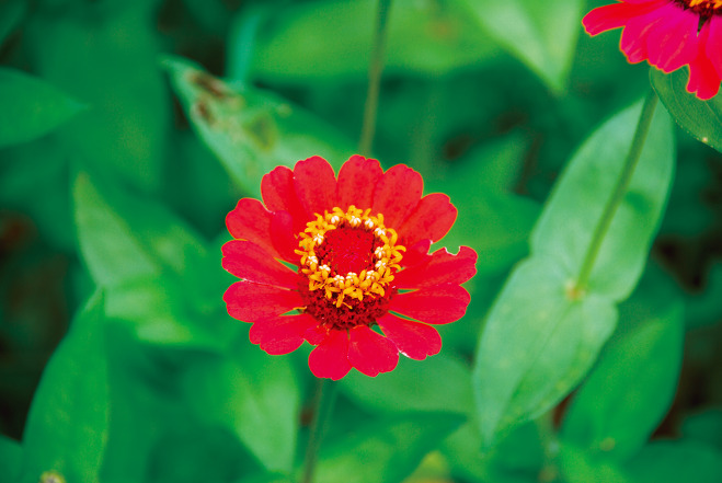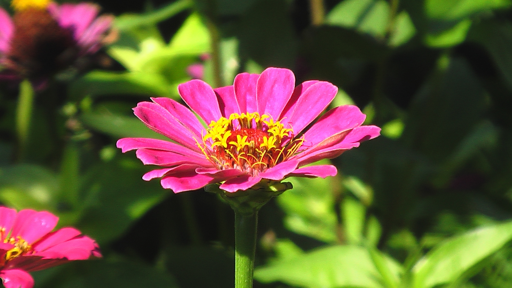 국화과의 한해살이풀. 꽃의 크기는 5∼15cm이고 빛깔은 진홍색, 다홍색, 노란색 등으로 매우 다양하다. 가장자리에 암꽃인 혀 모양 꽃이 8~20개가 핀다. 가운데 양성 꽃인 꽃부리 끝이 5갈래로 갈라진 관 모양의 꽃이 핀다. 잎은 길이 4~6cm, 폭 3~5cm이다. 끝이 뾰족하며 밑 부분은 심장 모양이다.