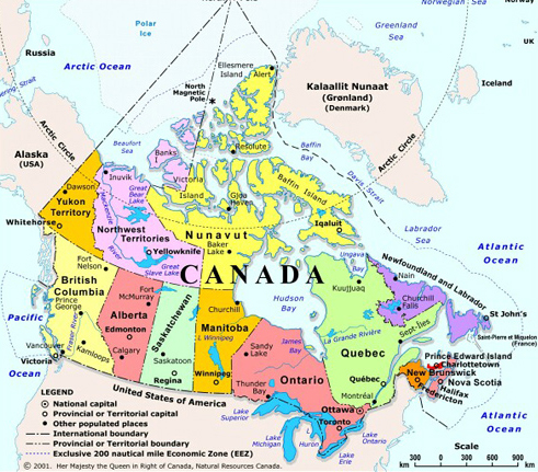 Canada is a country in North America. Its ten provinces and three territories extend from the Atlantic Ocean to the Pacific Ocean and northward into the Arctic Ocean, covering over 9.98 million square kilometres (3.85 million square miles), making it the world's second-largest country by total area. Its southern and western border with the United States, stretching 8,891 kilometres (5,525 mi), is the world's longest bi-national land border.