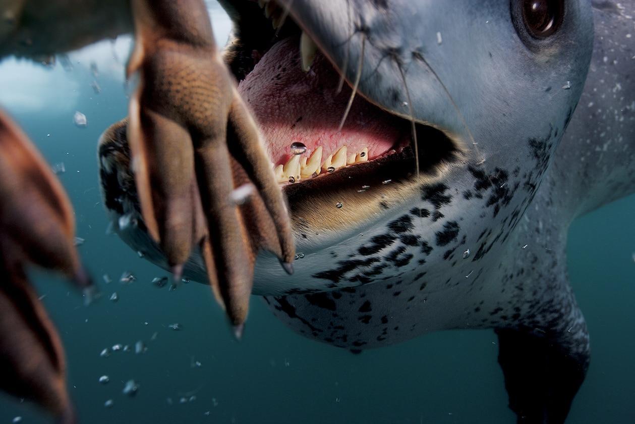 Animal photographers take themselves to the limit to capture the best photo of a species. In this case, photographer Paul Nicklen found a 12-foot-long leopard seal in the Antarctica sea in 2006. A fast and fierce animal.