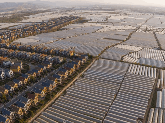 Here we can see hundreds of greenhouses that grow high-value crops, side by side with suburban housing. Those flooded croplands look like metal tubes if you think about it!