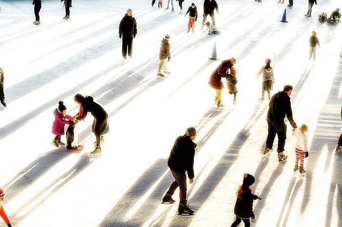 The sun is shining so bright that it barely lets us appreciate the icy ground where these families are skating. Through their shadows, we see the ice on which they’re sliding. This photo was taken in Prospect Park, Brooklyn, NYC.