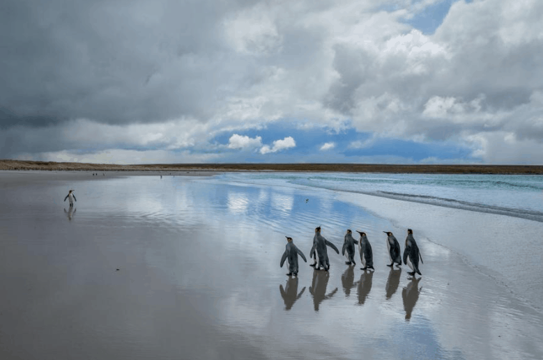 A group of king penguins makes their way down the beach in Volunteer Point, located in East Falkland Island. How cute are they?