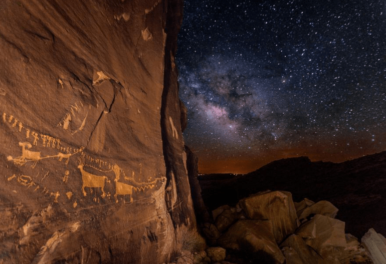 Procession Panel, a 23-foot-long, 1,000-year-old petroglyph, is illuminated by the starlit sky in Utah's Bears Ears Monument. According to astronomers, this is one of the most privileged sites for star-gazing in the country.