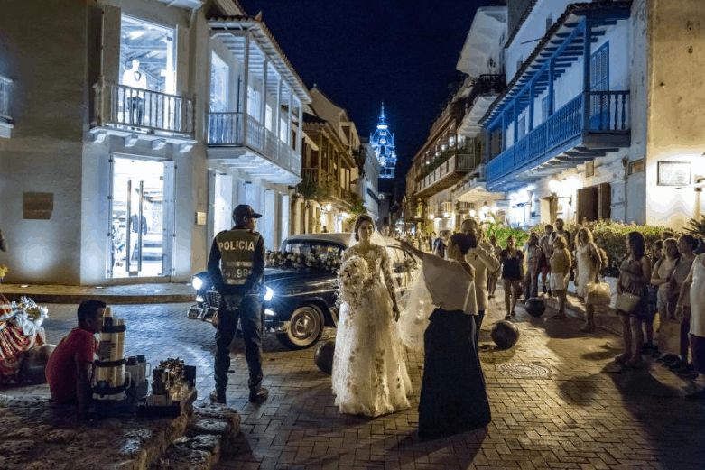This picture shows a crowd of people gathering in the street to watch a bride as she enters a church in Cartagena, Colombia. Honestly, I can't think of a more picturesque place to tie the knot.