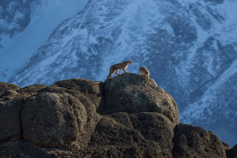 A puma pursues a female after an all-day courtship at the top of a hill near the Torres del Paine National Park in southern Chile. What do you find most striking, the felines or the view?