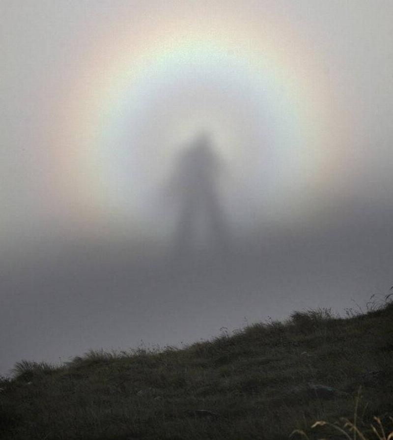 The light casts the person’s shadow on a cloud at a lower altitude making it look like a giant human lurks in the fog.