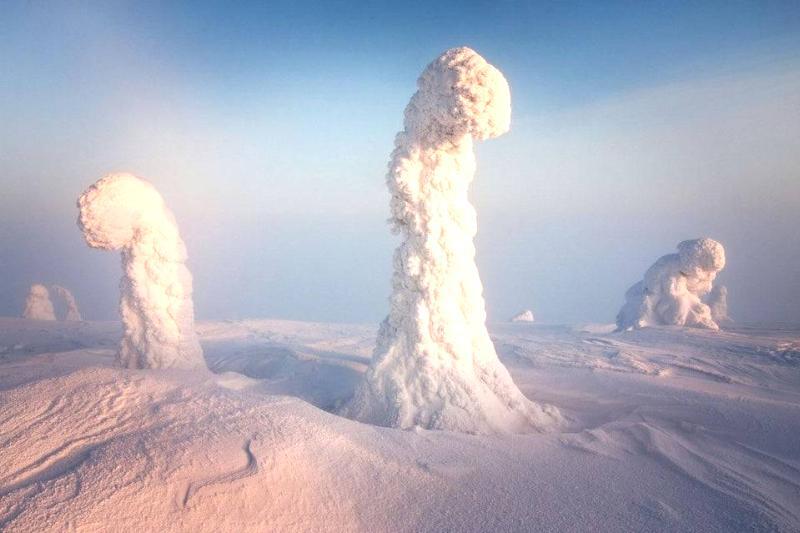 In Finland, the winter temperatures easily drop below -40°F which results in large amounts of snow freezing to the trees.