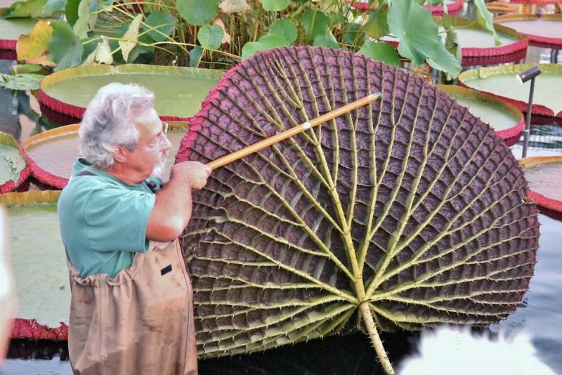The giant water lily is native to South America and produces the largest lily pad in the world.