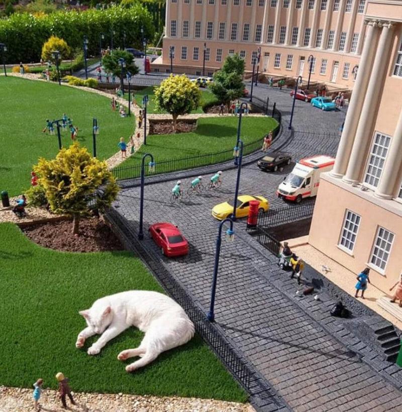 The miniature model pedestrians make the cat look like a gigantic sleeping beast next to the tiny people and cars.